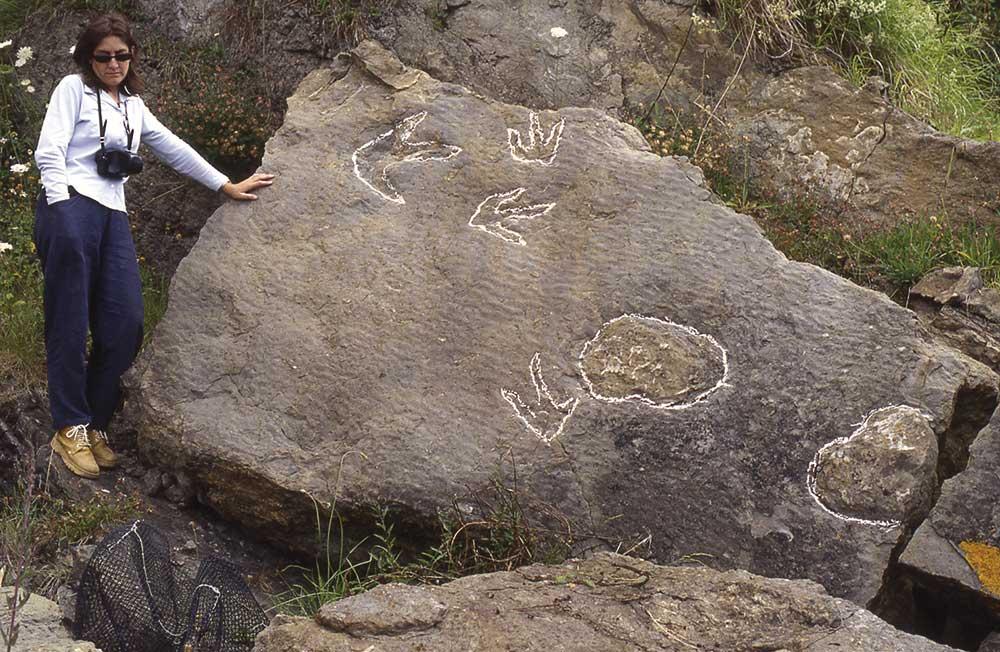 Unos metros mas allá se observa un bloque suelto de arenisca con varias huellas tridáctilas de terópodos y otras ovaladas de dinosaurios cuadrúpedos.